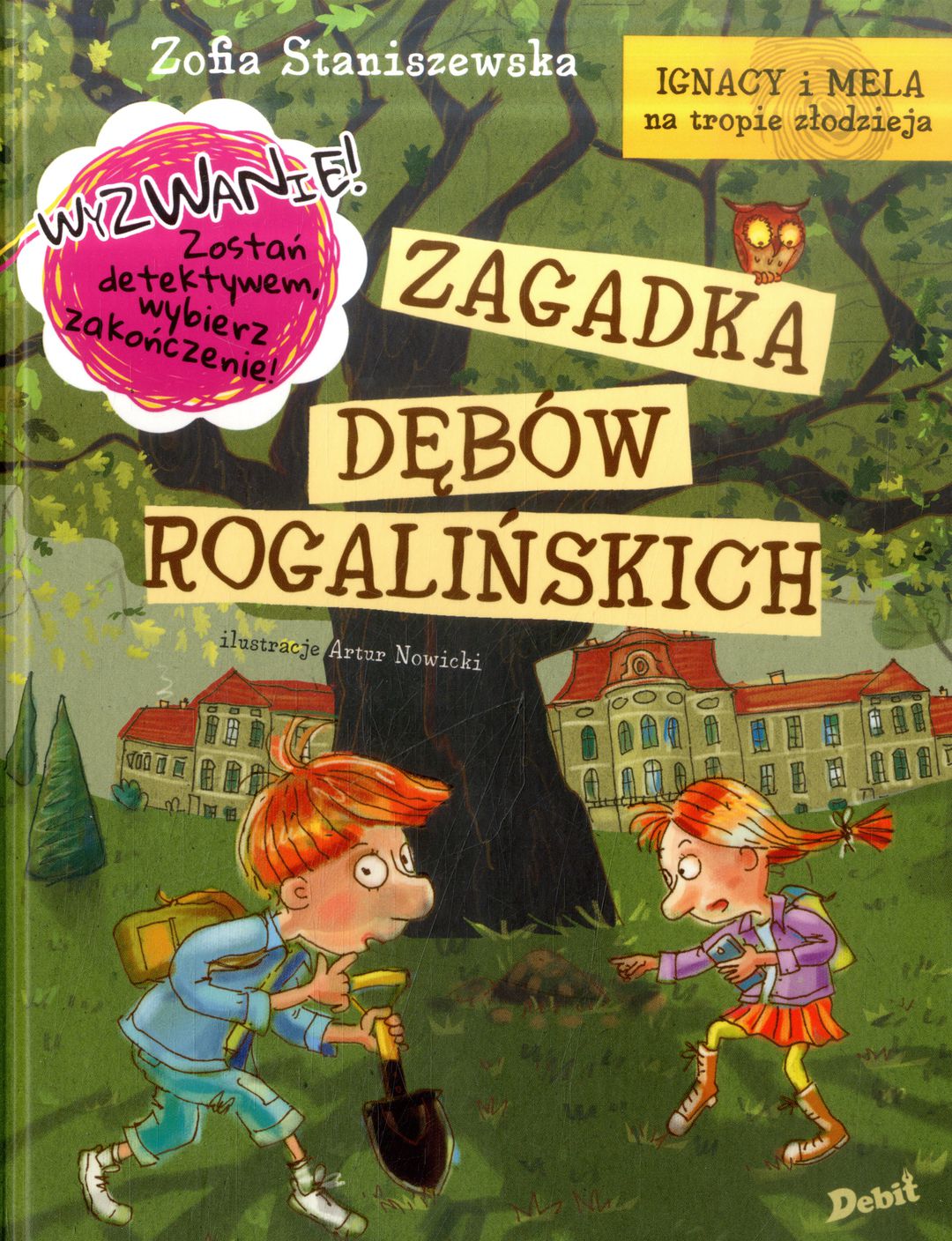 Ciąg dalszy ekscytujących przygód sympatycznych bliźniąt. Tym razem Mela i Ignacy są świadkami zamieszania, jakie zapanowało w Pałacu w Rogalinie podczas rozstrzygnięcia konkursu literackiego na najlepszy kryminał. W trakcie gali znika główna nagroda - figurka przedstawiająca słynne dęby rogalińskie. Ignacy i Mela są w swoim żywiole, próbując rozwikłać zagadkę. Podczas śledztwa trafiają na coraz dziwniejsze tropy. Przy okazji wychodzą na jaw tajemnice pracowników pałacu. Czytelnicy mają kolejną okazję, by wcielić się w rolę detektywów i samodzielnie zadecydować, którym tropem warto podążać - umożliwiają to alternatywne zakończenia tej historii. Niezapomniane wrażenia gwarantowane!